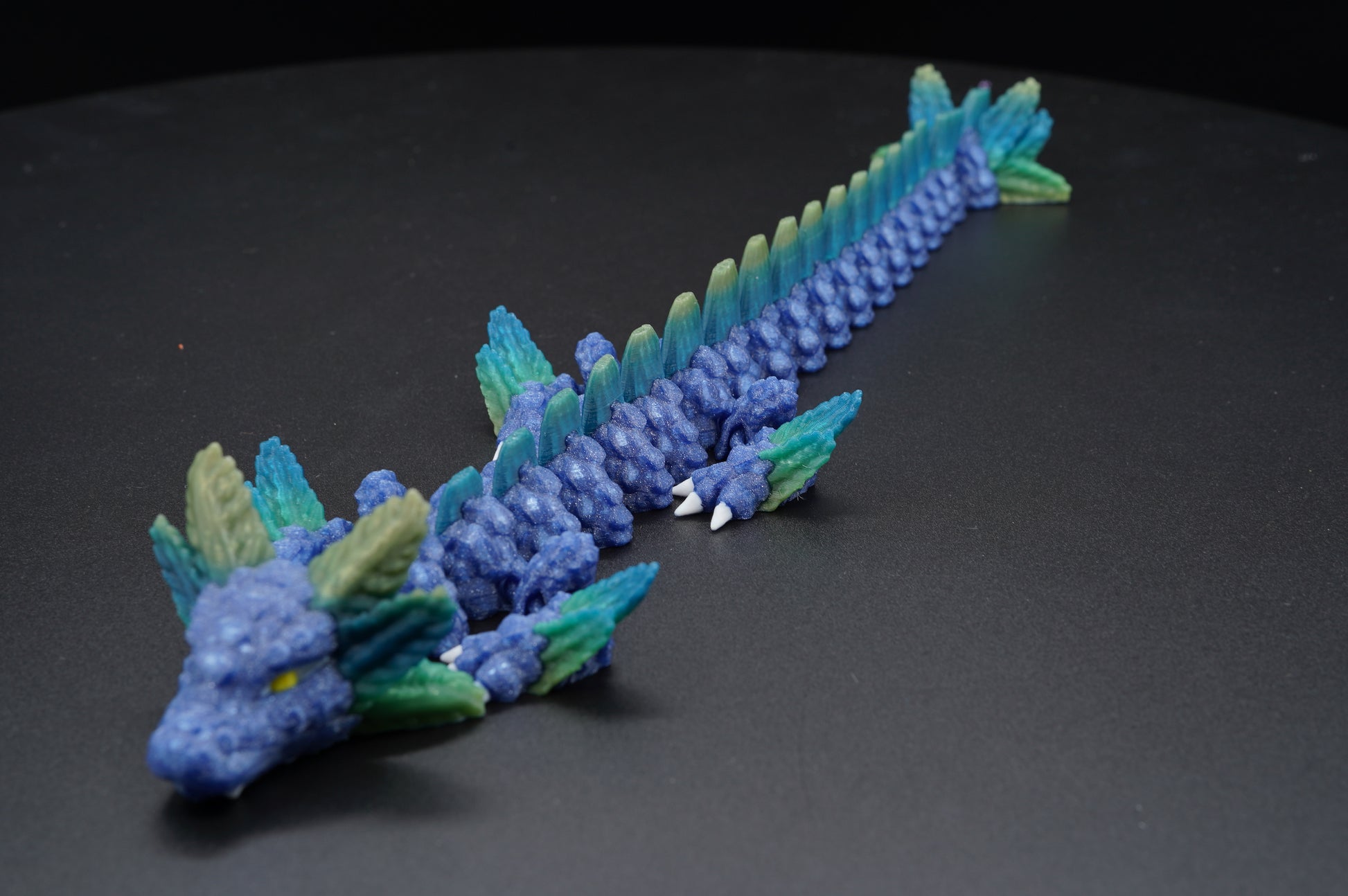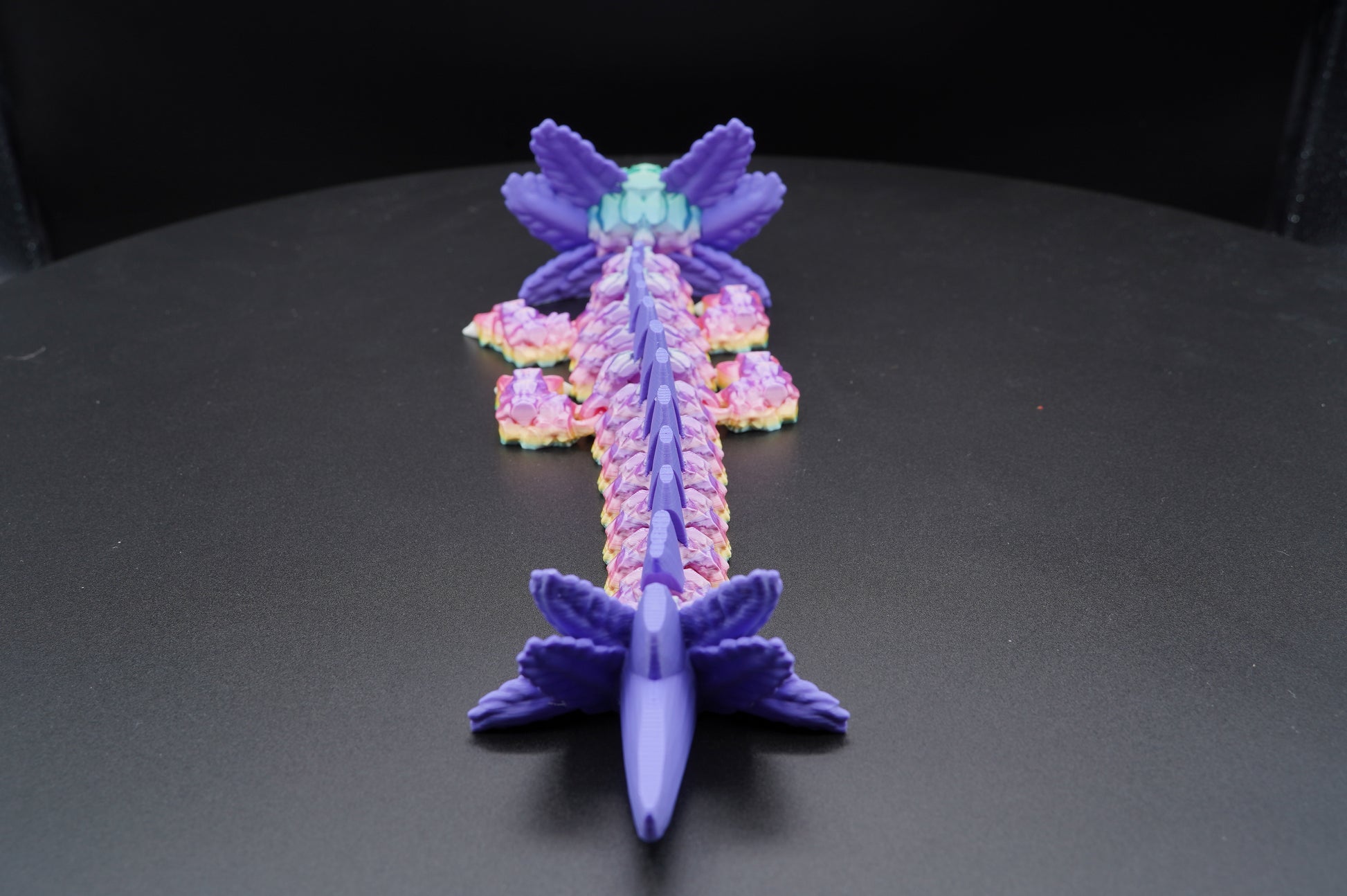 A striking and whimsical articulated axolotl dragon, designed to bring aquatic charm and fantasy magic to any desk, shelf, or collection. This 12.5" Axolotl Dragon is 3D printed as one complete, fully assembled piece and makes a captivating display item or collectible.