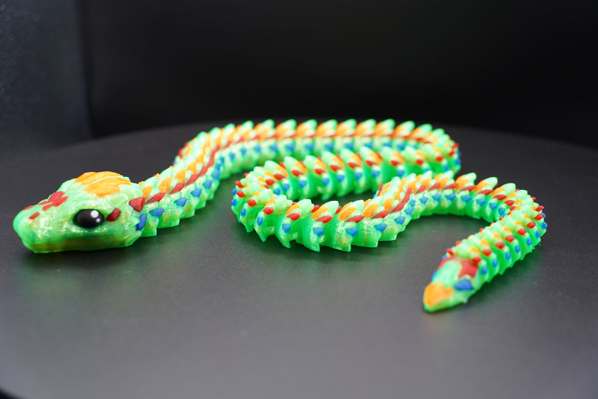 This articulated snake features expressive eyes, a fully segmented flexible body with intricate scale detailing, and incredible possability that allows it to coil, curve, and twist into endless positions. Its striking multi-color pattern featuring bright green, orange, blue, and red creates a rainbow effect along its entire length, giving it a vibrant and eye-catching appearance that captures the beauty of a serpent in a large, impressive form.