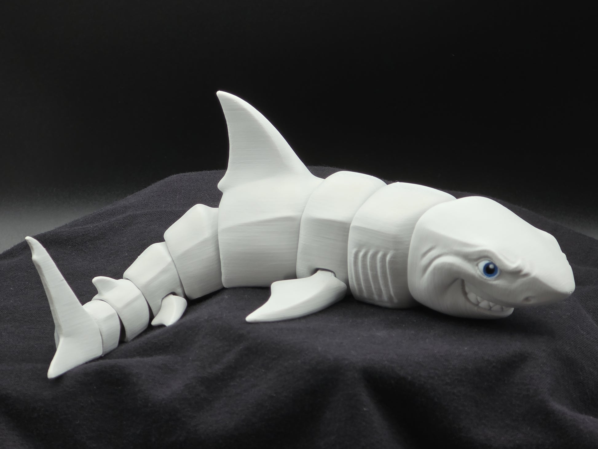 A bold articulated Great White Shark with smooth segmented movement and an expressive sculpted face. 3D printed as one complete piece and designed for display, desk décor, or collecting.