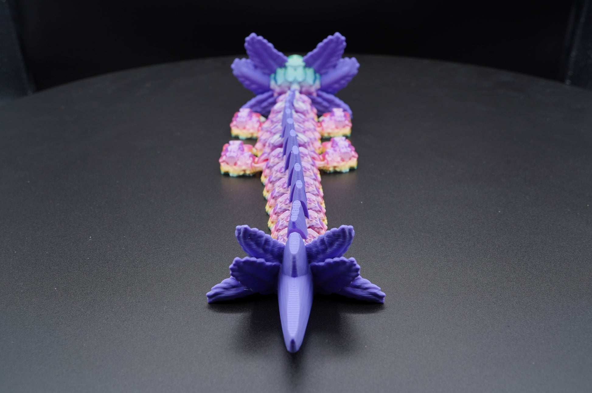 A striking and whimsical articulated baby axolotl dragon, designed to bring aquatic charm and fantasy magic to any desk, shelf, or collection. This 12" Baby Axolotl Dragon is 3D printed as one complete, fully assembled piece and makes a captivating display item or collectible.