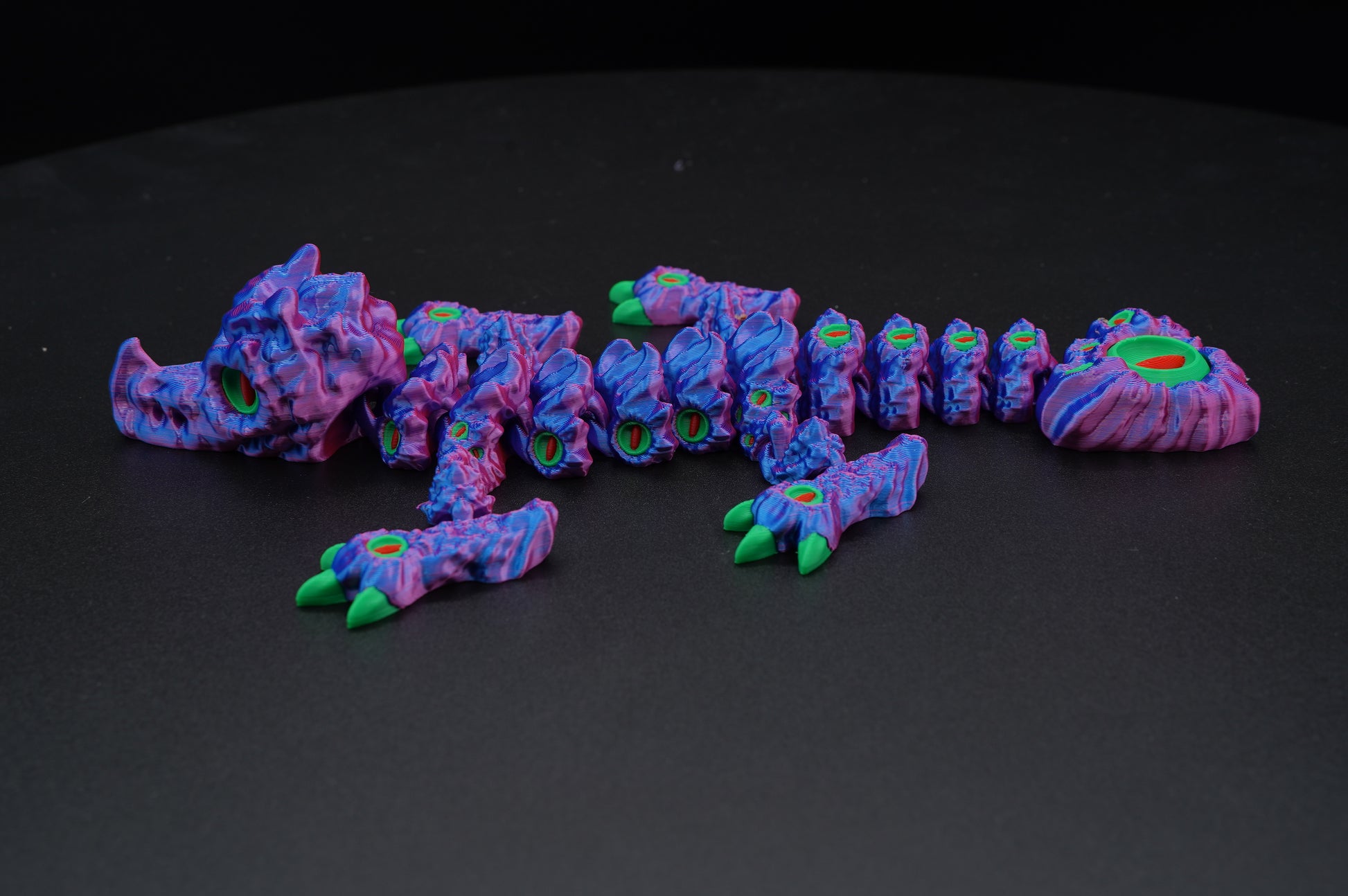 This articulated dragon features expressive eyes, a segmented flexible body, and poseable legs that allow gentle movement and positioning. Its distinctive textured scale pattern covering the entire body, dramatic spikes along the spine, elegant curved tail, and intricate detailing give it a magical yet mysterious appearance, capturing the enchanting spirit of a cursed dragon in a compact, impressive form.