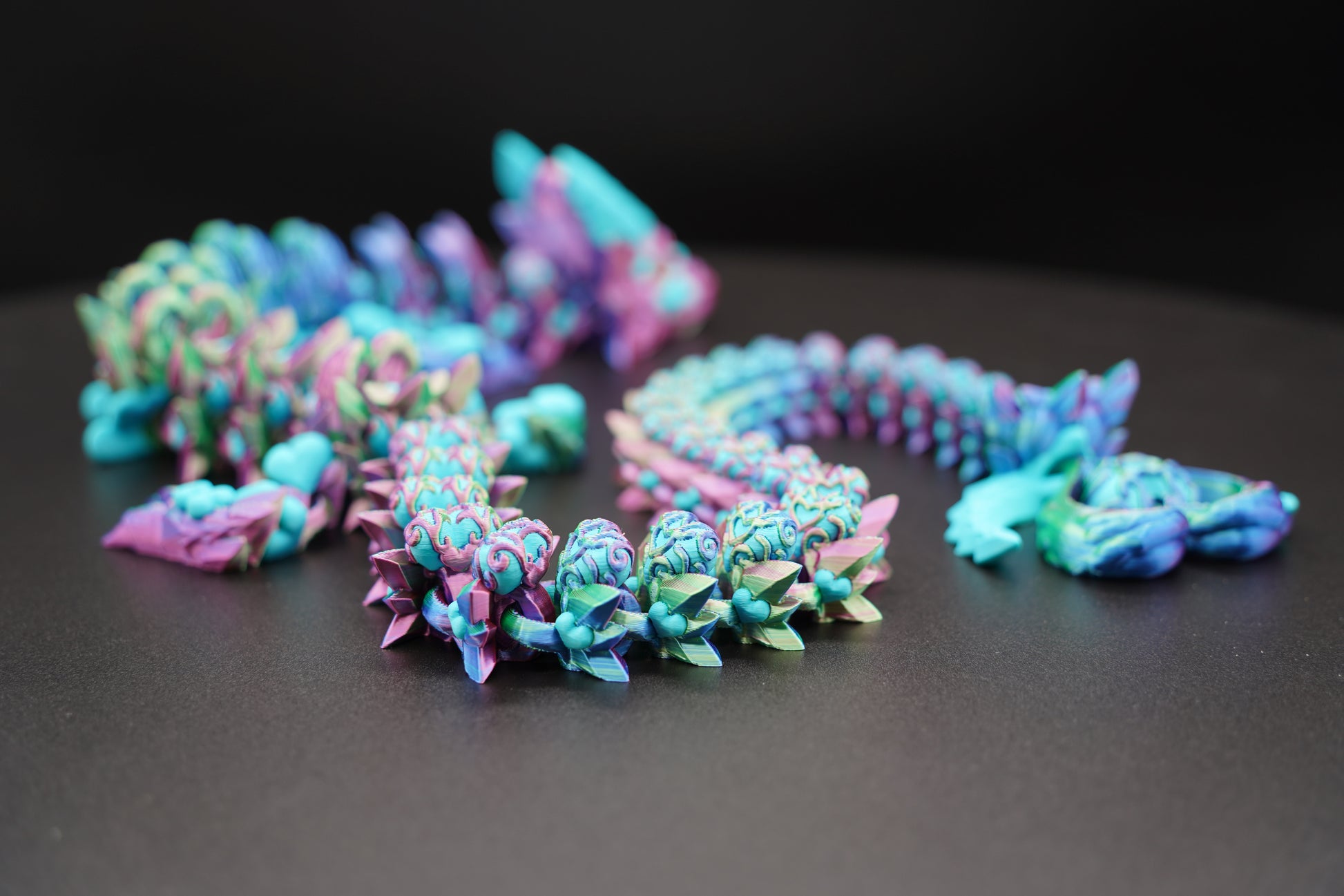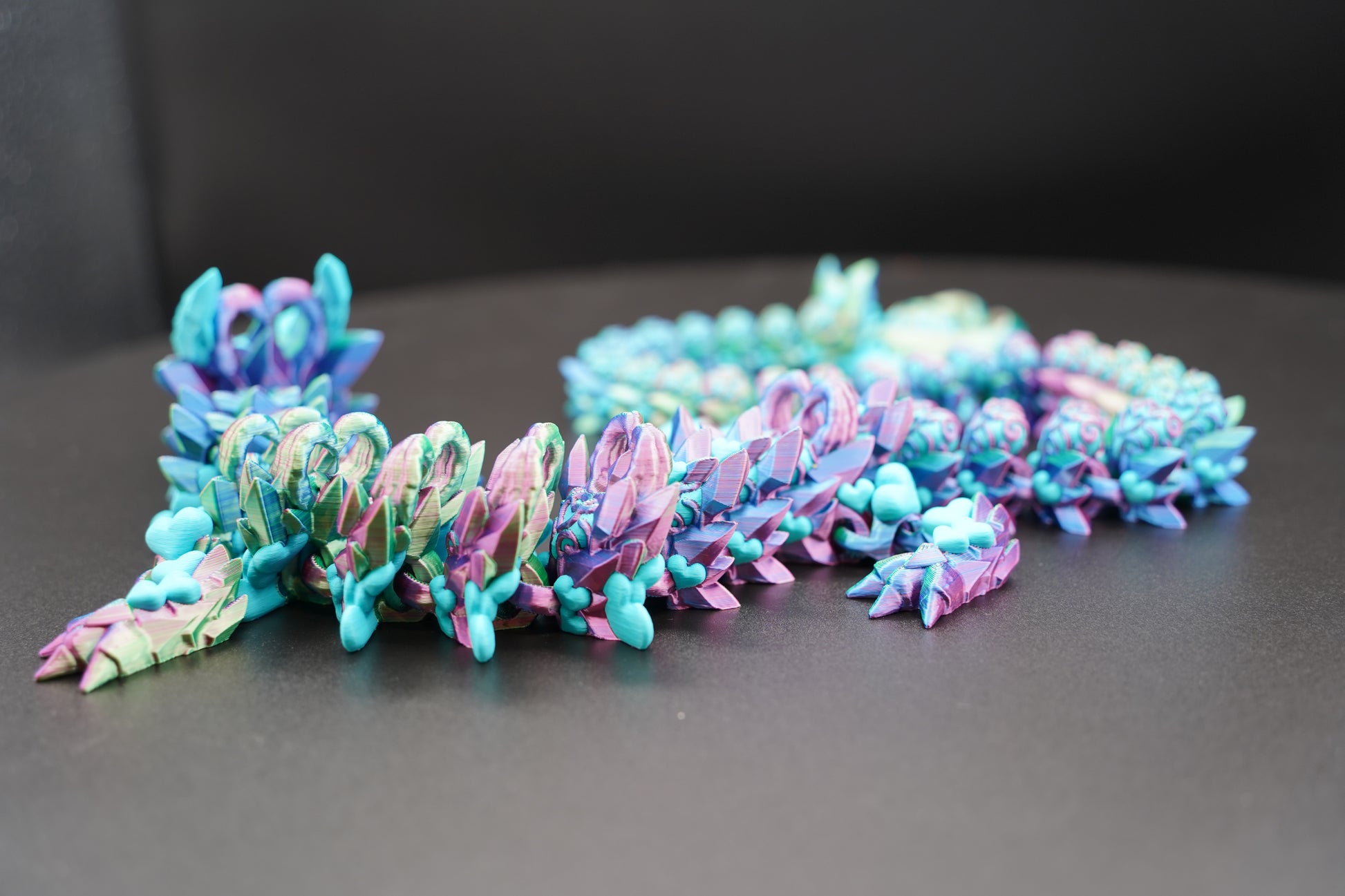 Available in a variety of color combinations. Due to filament variation and the 3D printing process, each Dark Heart Dragon is unique.