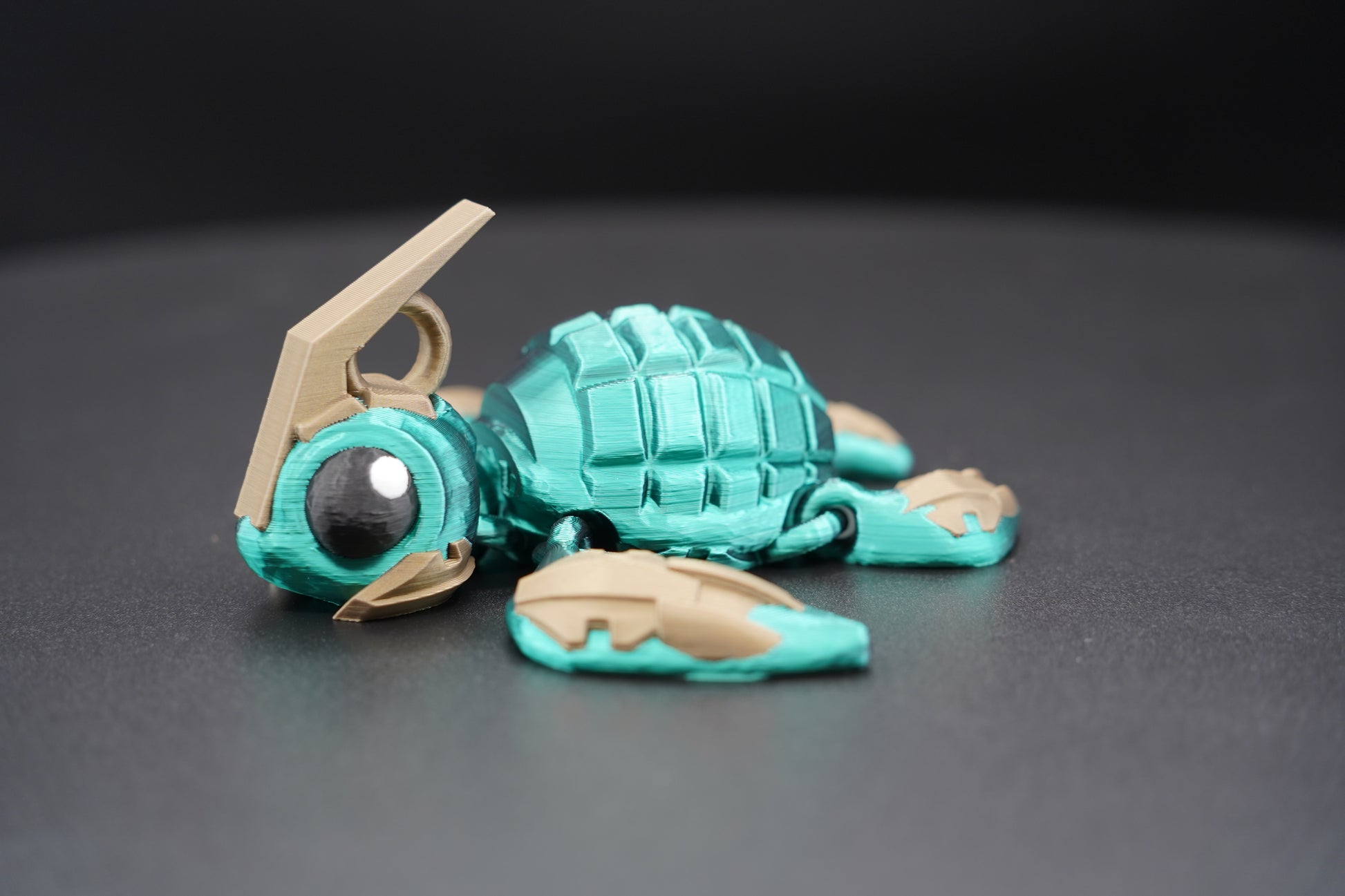 A charming and playful articulated grenurtle, designed to bring whimsical charm and fantasy fun to any desk, shelf, or collection. This Grenurtle is 3D printed as one complete, fully assembled piece and makes a captivating display item or collectible.