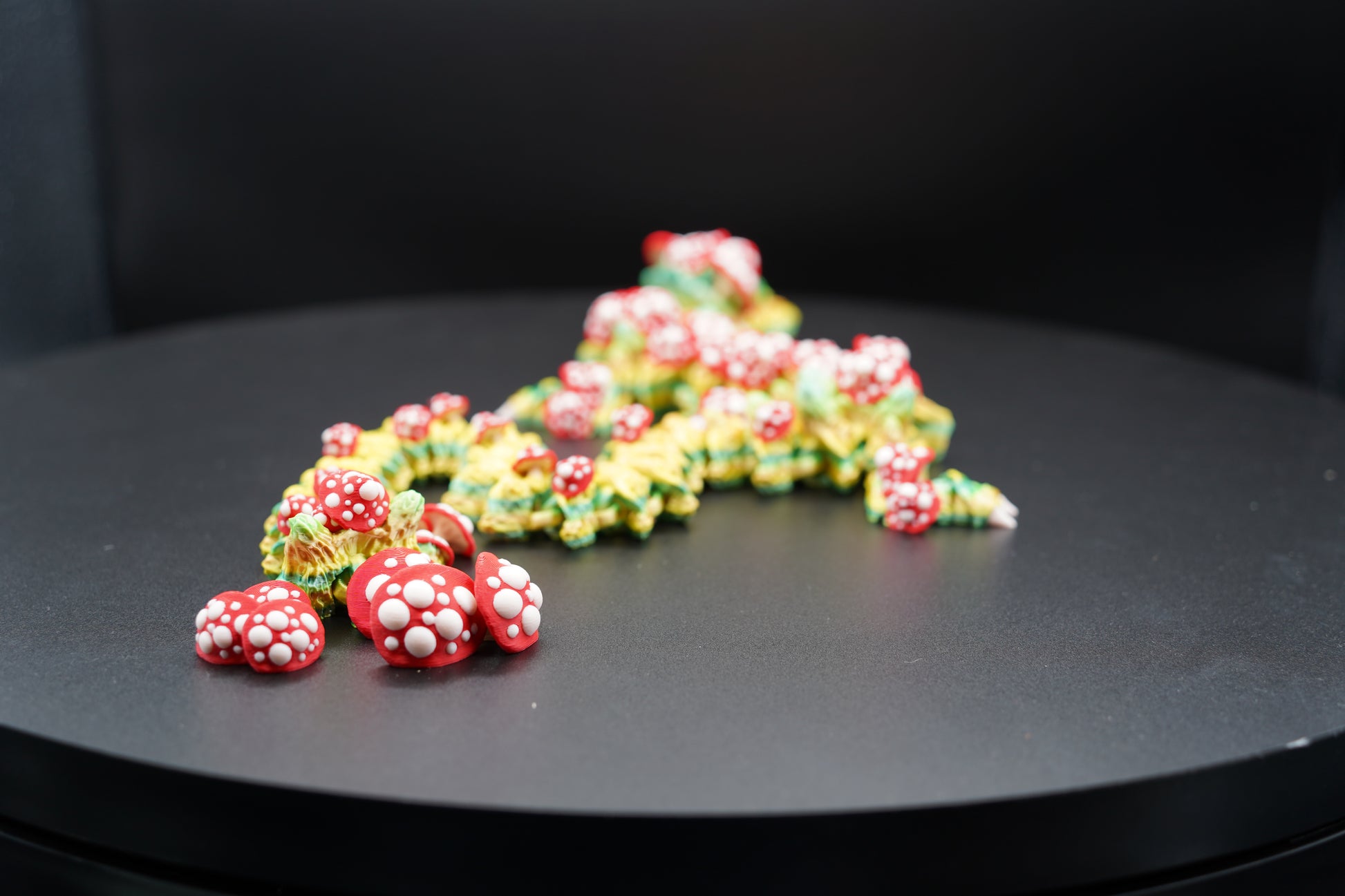 Available in a variety of color combinations. Due to filament variation and the 3D printing process, each Mushroom Dragon is unique.