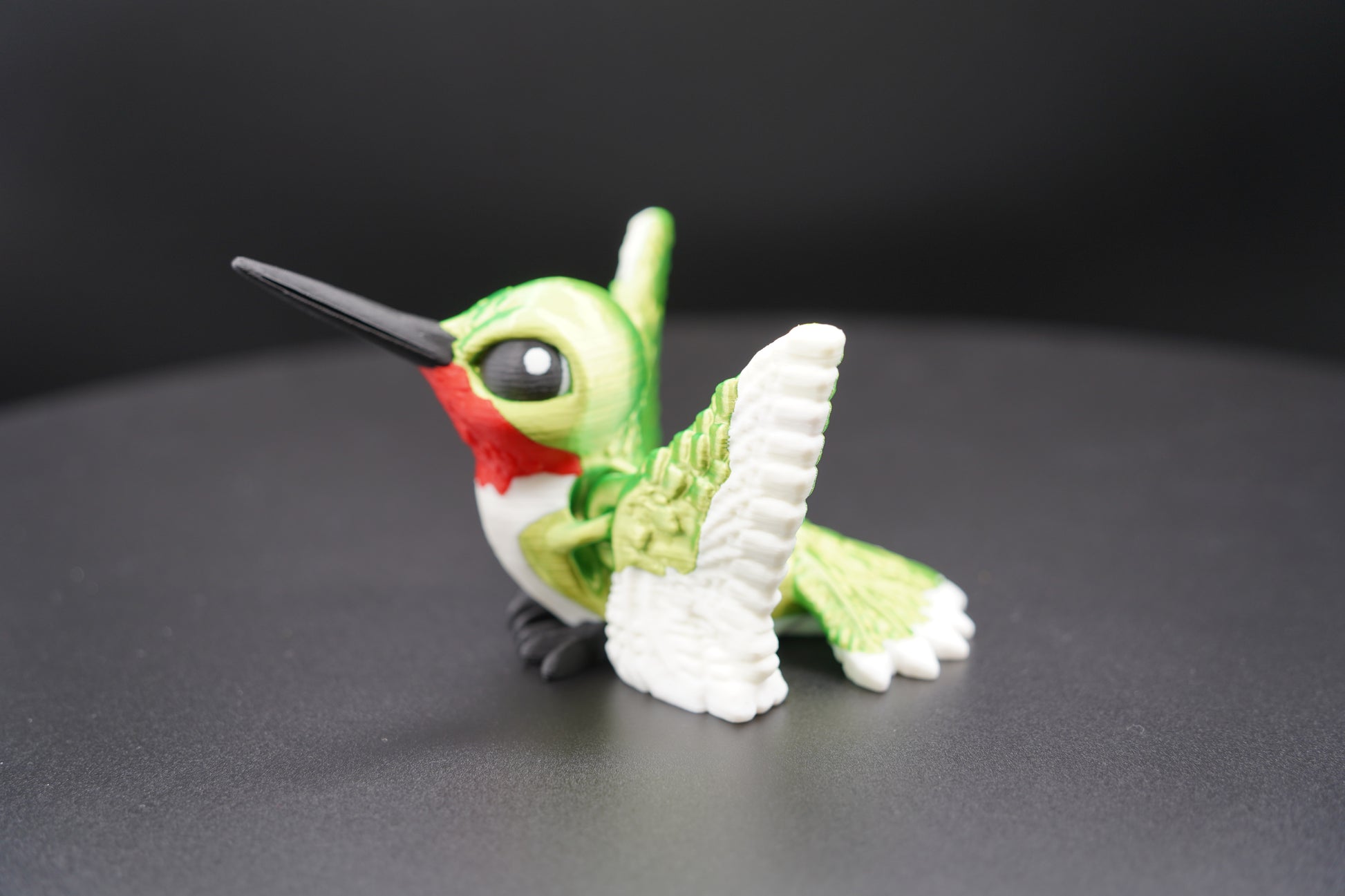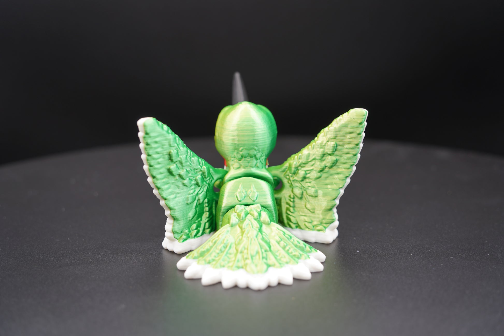 A charming and elegant articulated small humming bird, designed to bring natural beauty and whimsical charm to any desk, shelf, or collection. This Small Humming Bird is 3D printed as one complete, fully assembled piece and makes a captivating display item or collectible.