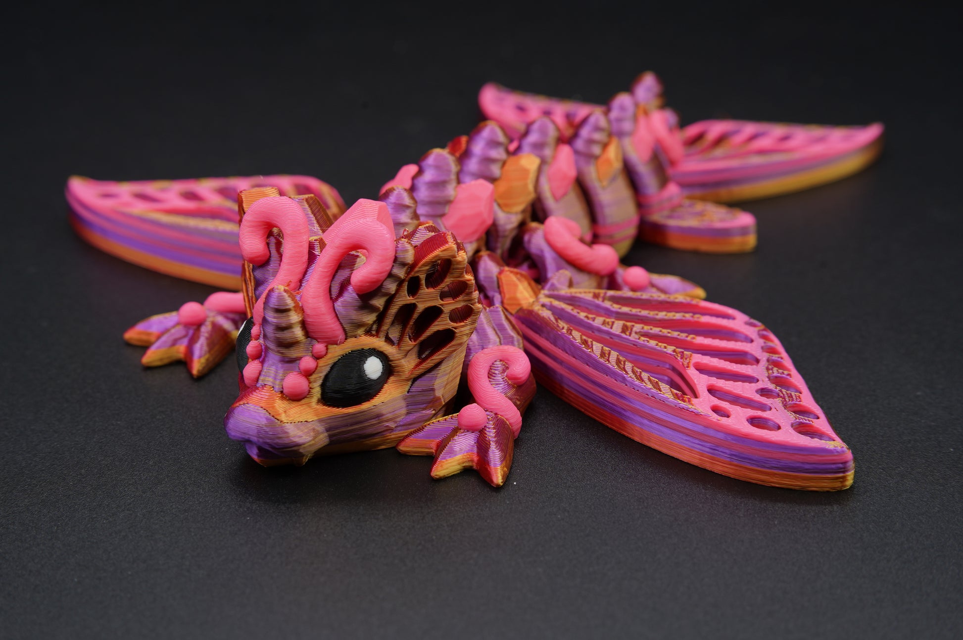 This articulated dragon features expressive eyes, a segmented flexible body, and poseable legs that allow gentle movement and positioning. Its distinctive butterfly-inspired wings with intricate patterns, elegant curved body, detailed scales and spikes, flowing tail, and intricate detailing give it a magical yet majestic appearance, capturing the enchanting spirit of a butterfly dragon in a compact, impressive form.