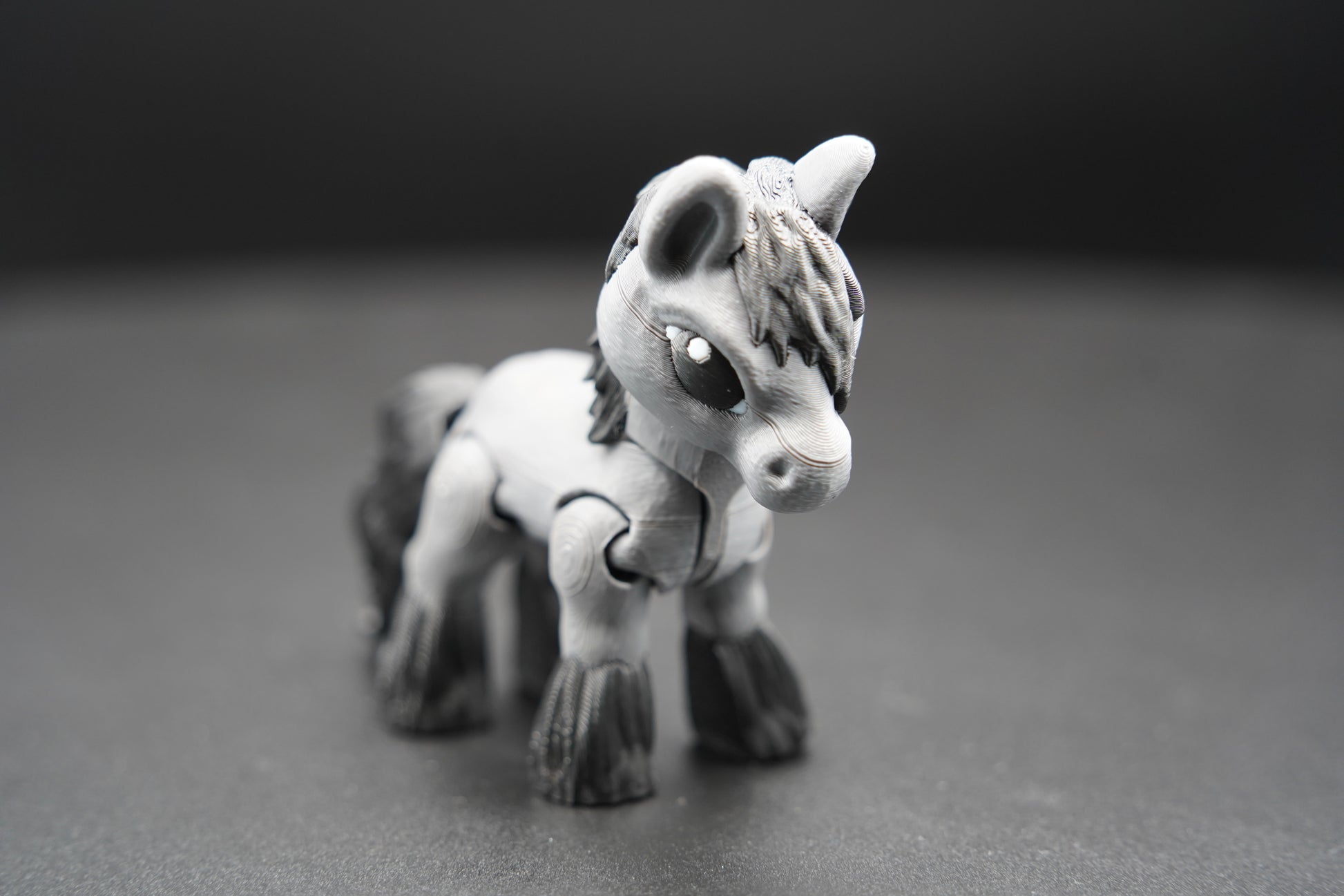 A striking and graceful articulated tiny horse, designed to bring natural elegance and whimsical charm to any desk, shelf, or collection. This 4" Tiny Horse is 3D printed as one complete, fully assembled piece and makes a captivating display item or collectible.
